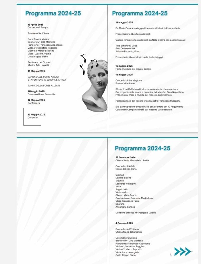 Al Contrabbasso Pasquale Maddaluno, all'oboe Francesco Parisi, mentre il Soprano sarà Annamaria Sanges. La direzione artistica è affidata al maestro Pasquale Valerio direttore d'orchestra di fama internazionale. Il quattro gennaio 2025, invece, il Concerto dell'Epifania, sempre presso la Chiesa Santa Maria della Sanità. Il 13 aprile 2025, inoltre, il Concerto di Pasqua presso il Santuario Sant'Anna con il Coro Sonora Musica diretto dal maestro Ciro Montella.