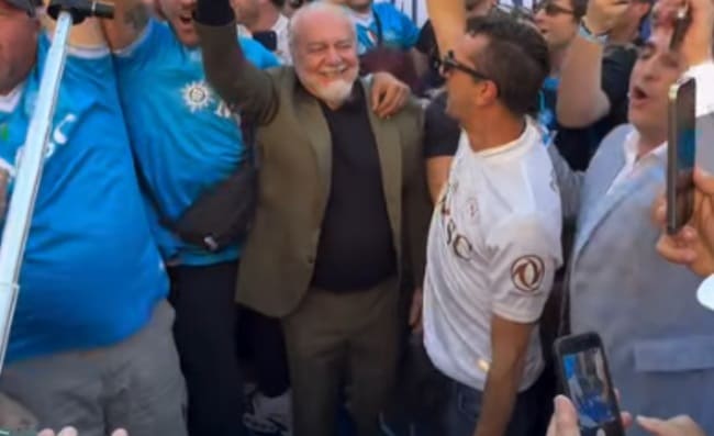Il patron azzurro ha cantato e saltato insieme a loro sulle note del classico sfottò "Chi non salta juventino è", dimostrando ancora una volta il suo legame profondo con la tifoseria.