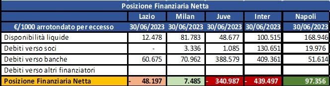 Ci siamo divertiti a verificare in maniera artigianale la PFN delle 5 squadre di vertice del campionato di serie A (tabella n°1). Non bisogna essere dei maghi della finanza per capire che il Napoli, in questo momento ha in cassa circa 97 milioni di euro e le due attuali capoliste (Inter e Juve) hanno, invece, debiti per 440 milioni e 340 milioni di euro!!