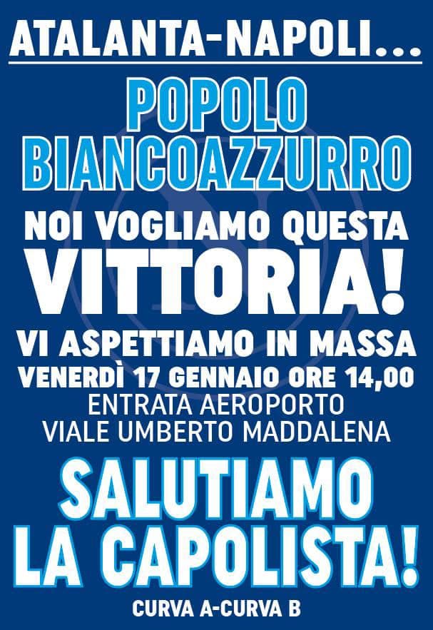 Gli uomini di Antonio Conte vogliono conquistare un risultato importante per continuare a lottare per lo Scudetto. Intanto gli ultras di Curva A e B hanno diramato un volantino: "Atalanta-Napoli... popolo biancoazzurro, noi vogliamo questa vittoria! Vi aspettiamo in massa venerdì 17 gennaio ore 14.00 entrata aeroporto viale Umberto Maddalena. Salutiamo la capolista! Curva A-B", si legge nel volantino diffuso in queste ore.