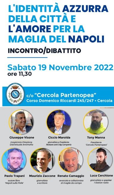 "L'identità azzurra della città e l'amore per la maglia del Napoli": questo il titolo dell'incontro in programma domani 18 novembre alle ore 11.30 presso la sede di Cercola Partenopea in corso Domenico Riccardi. Ad intervenire al dibattito saranno: Francesco Marolda, Presidente Revisori dei conti Ordine dei giornalisti della Campania, Giuseppe Visone, Magistrato Dda di Napoli, Paolo Trapani, autore del saggio "Napoli sulla Pelle", Tony Manna, Presidente di Cercola Partenopea, Maurizio Zaccone, blogger e giornalista, Renato Camaggio, avvocato e collezionista di maglie da campo, Luca Cerchione, speaker di 1 station radio.