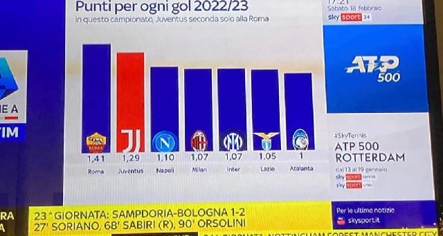 La redazione sportiva di SKY, probabilmente per trovare un senso a una stagione che sembra archiviata da tempo (almeno per quello che concerne la lotta al vertice), mostra una classifica dei punti ottenuti per ogni gol nel campionato di Serie A 2022-2023. Si contano quanti punti ha ottenuto ogni squadra in rapporto ai gol segnati. In questa graduatoria il Napoli arriva solo terzo, dietro Roma (prima) e Juventus (seconda). Tante le risposte sdegnate dei tifosi del Napoli riassumibili così: "Le inventano tutte per mettere gli azzurri dietro".