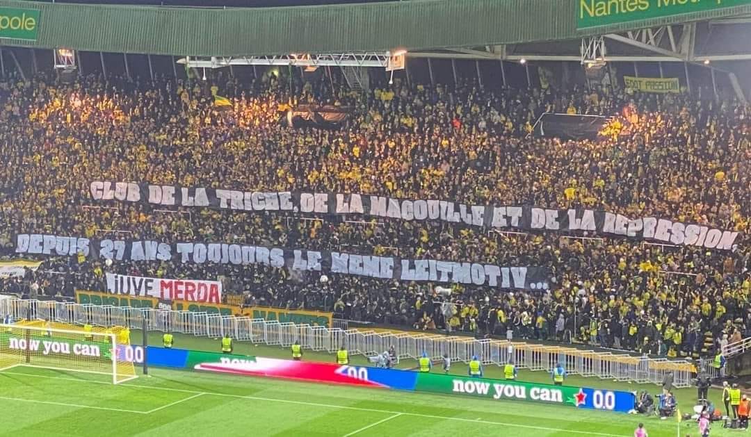 Tifosi del Nantes contro la Juventus. Prima della partita è stato srotolato un lunghissimo striscione: "Club de la triche, de la magouille et de la répression. Depuis 27 ans, toujours le même leitmotiv…", ovvero: "Club di imbrogli trucchi e repressione … 27 anni sempre lo stesso leitmotiv" con l'aggiunta di un insulto piuttosto diretto in italiano: "Juve mer*a", chiarissimo il messaggio dei tifosi francesi che provano grande odio verso la Juventus.